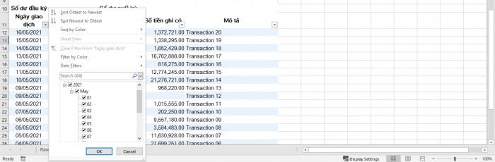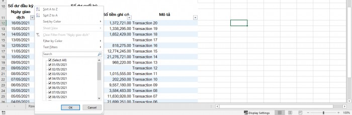 - Về "Ngày giao dịch", khi mở file lên, các bạn chọn Filter để kiểm tra nhanh format. Nếu format của các bạn như hình bên dưới, thì ok và không cần làm gì cả.