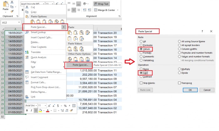 - Chọn vùng cần phải format, cụ thể từ A12 - A31 => click phải chuột chọn Paste Special => cửa sổ Paste Special hiện ra => chọn Values và Add => click OK.